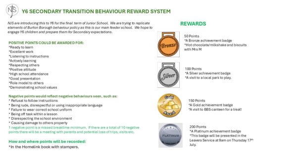 6 days ago Posted on 25th Mar 2026 by Mrs M Y6 Transition Behaviour Reward System After Easter we will be introducing the children to our Year 6 Transition Behaviour Reward system. This is explained for you below. Please discuss this with your child to help us to ensure standards remain high and that your children are Secondary ready in their behaviour and attitudes. We are looking forward to celebrating success with lots of opportunity for rewards.