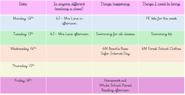 Happy new year everyone! Please find below everything that is happening in year 6 next week. See you all Tuesday 6th January.